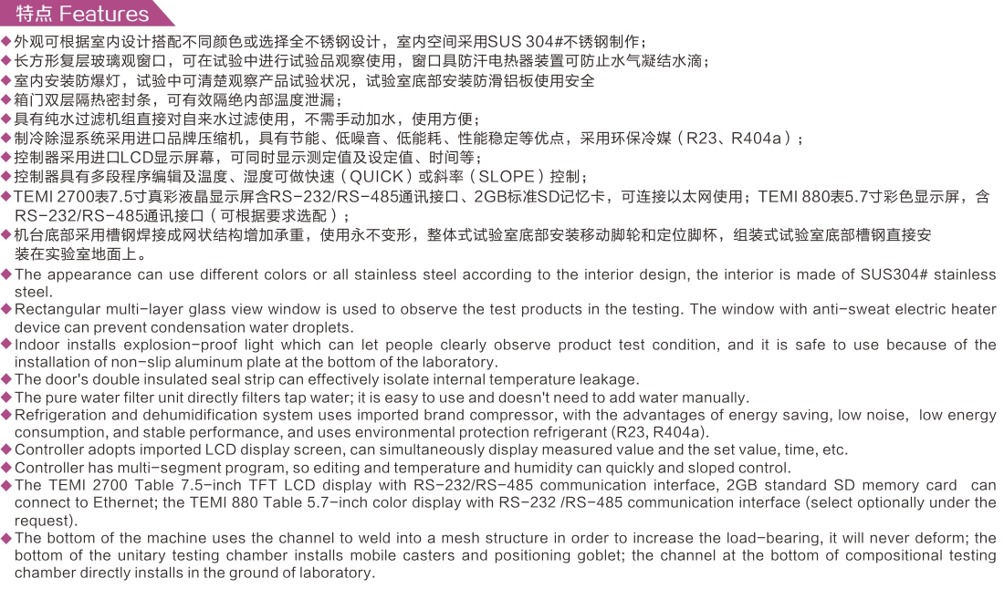 步入式恒温恒湿试验室主要由控制面版、配电盘、保湿库板送风机、加热器、加湿器、冷冻机组合而成。提供业界大型零件、半